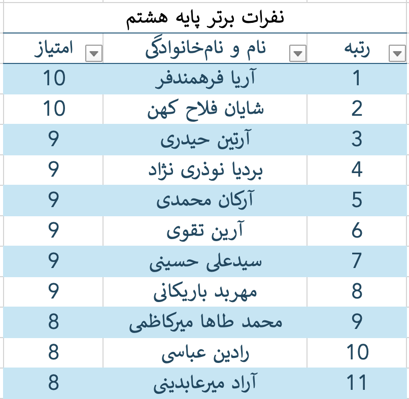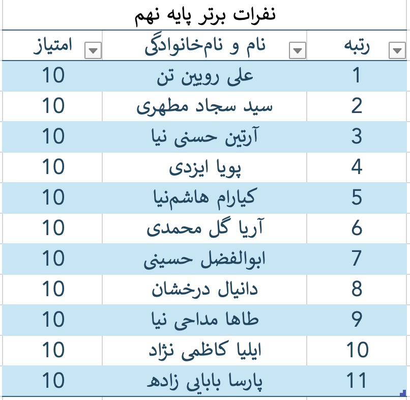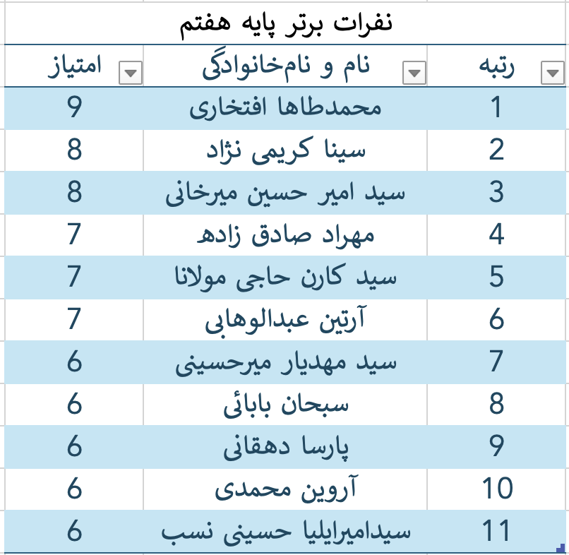 نفرات برتر هرپایه به صورت زیر اعلام میگردد: